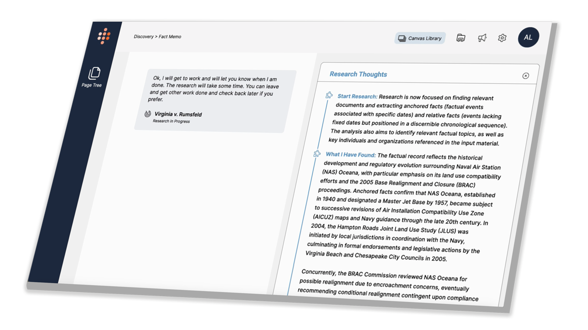 The AI Canvas is designed for the lawyer's most critical role: validation. Every AI assertion hyperlinks directly to the primary law, evidence, or transcript page and line number.