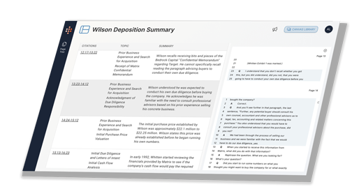 Generate detailed deposition summaries that include topics, timelines, and references to exhibits in a fraction of the time.